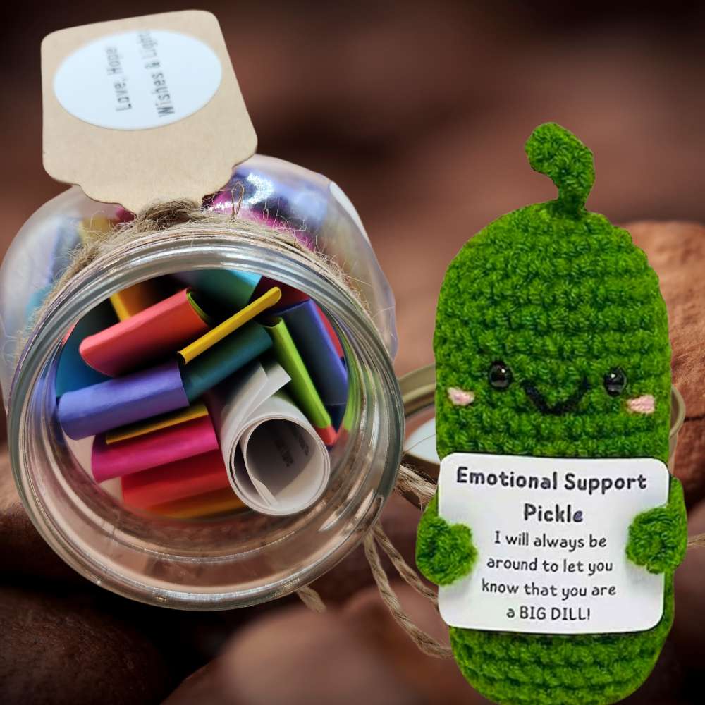 Give the gift of enduring love and affection with our "Pickle Jar of Love, Hope, Wishes and Light" - a beautifully crafted glass jar filled with Emotional Support Pickle and tender written notes each conveying heartfelt messages of love, hope, dreams, and the brightness she brings.